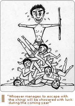 The Naked Man festival ("Hadaka Matsuri" in Japanese) is basically a mammoth battle of "Smear the Queer" (anybody else play that game in grade school? Perhaps a more "PC" name for the game has been created since then but I doubt it) involving almost 10,000 men wearing only sumo-style loin cloths. They gather at a temple just outside Okayama City on a very cold night in February. After several hours of chanting and marching around (fully "exposed" to the elements), a "Shingi" (a special scented stick -- I'm not making this up) is dropped from the rafters of the temple, into the swirling nude mass of men! Whoever manages to escape with the shingi (and take it all the way to City Hall four blocks away without getting beaten to death -- literally) will be showered with luck during the coming year (and win a substantial cash prize in case the Buddhist luck alone isn't enough incentive).